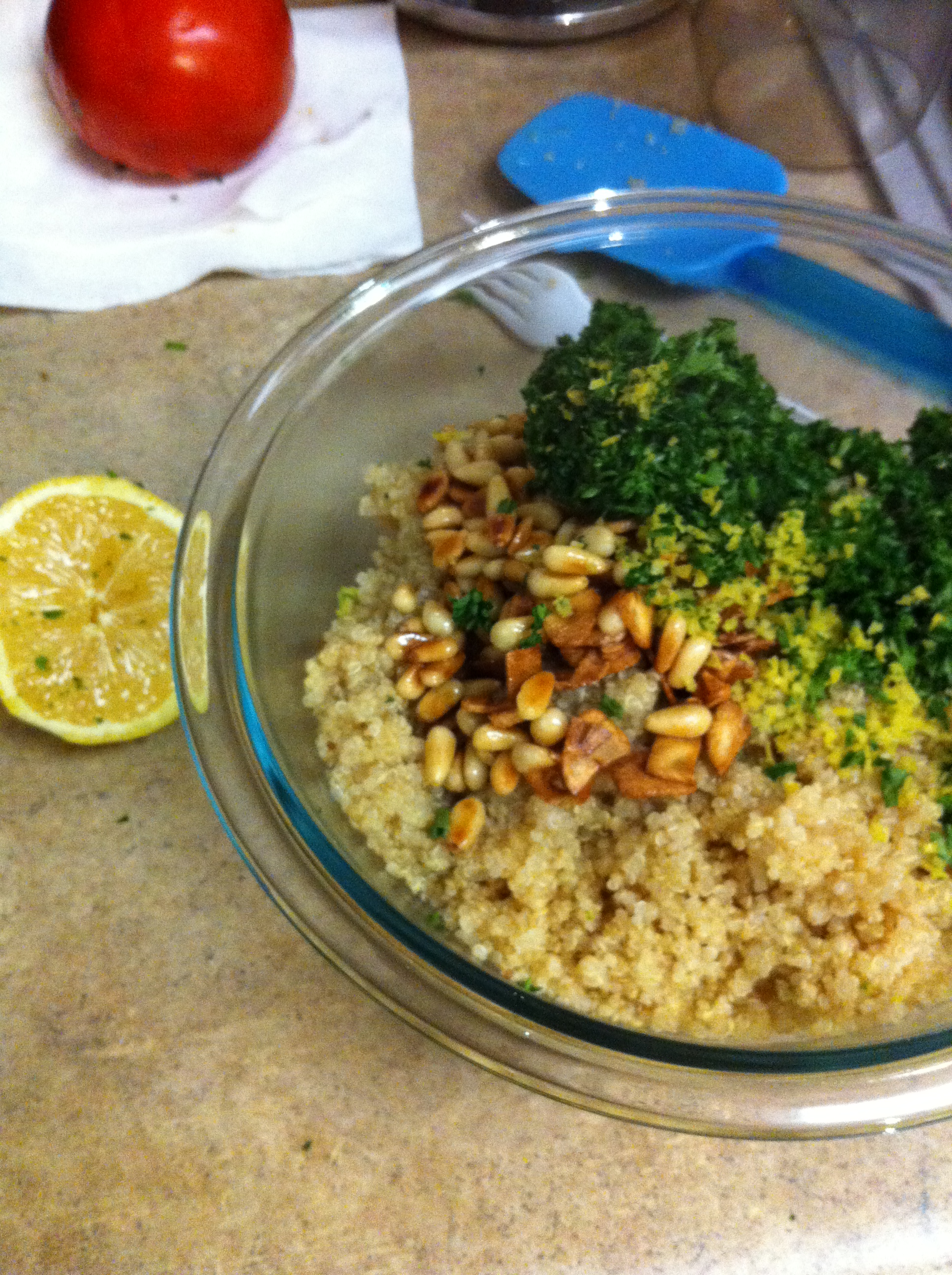 Fluff the quinoa with a fork, transfer it to a bowl.  Add the pine nuts, oil, garlic, fresh parsley, lemon juice, lemon zest, salt, and pepper.  At this point, if you’d like optional raisins, stir them in as well.  Your concoction, before tossing, will look a little like this: