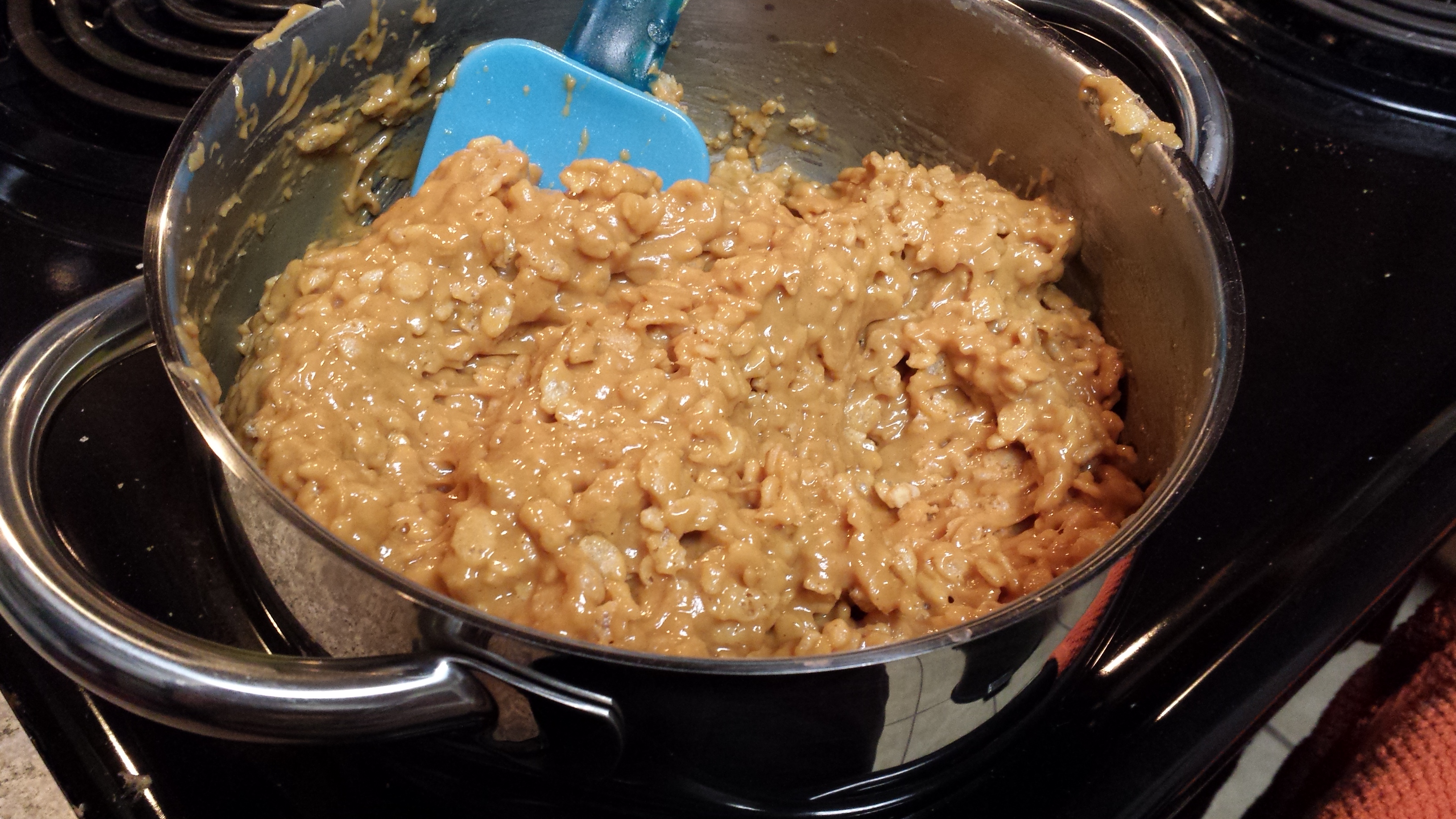 - Add peanut butter to the liquid and stir until well combined. Then add all of your cereal and, again, stir until evenly coated.