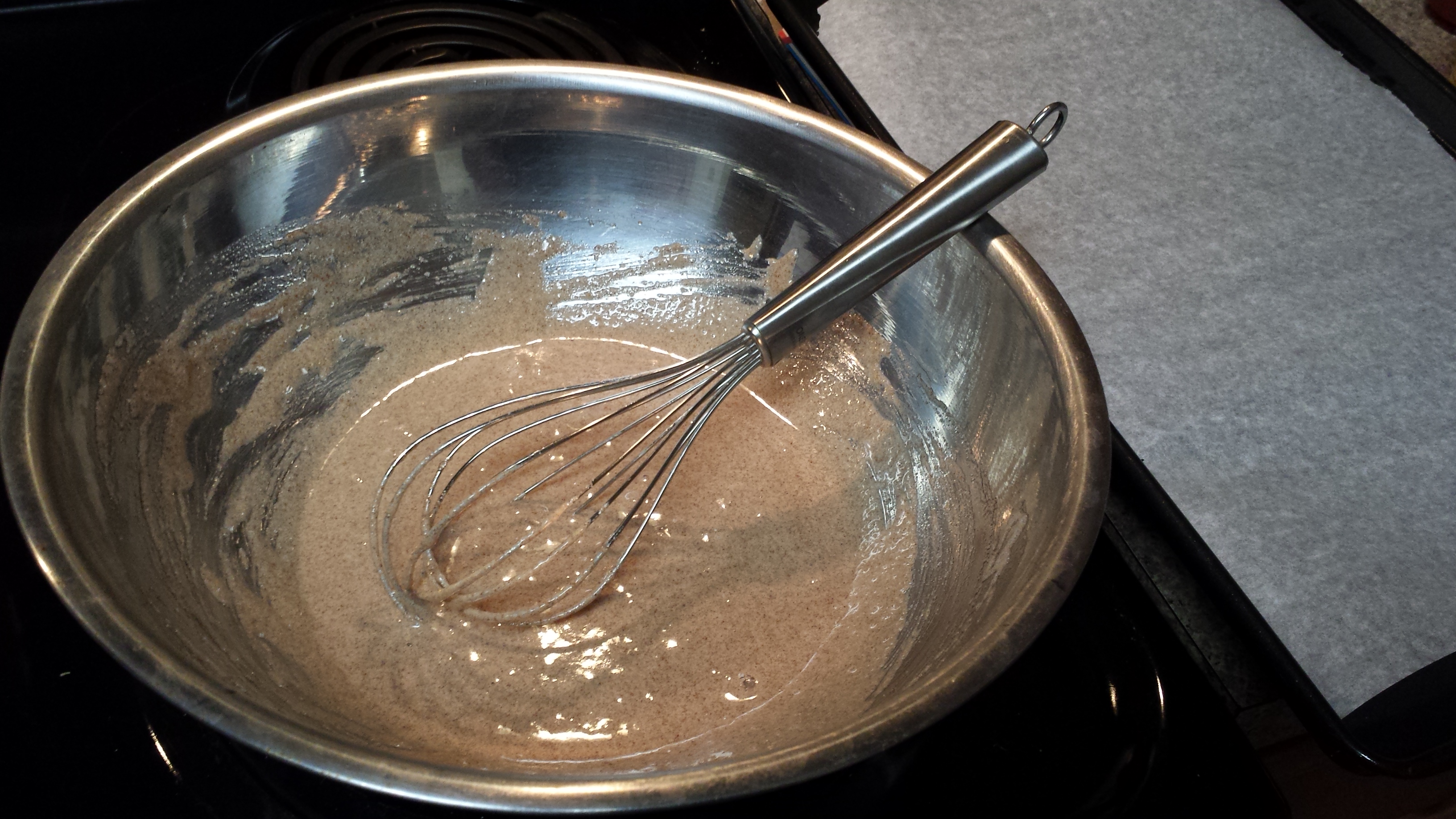 - In a large bowl, beat your egg white and water with a whisk until frothy. Combine your sugar, cinnamon, and salt (either in a separate bowl or in a plastic bag) and then whisk into egg mixture. Make sure all the ingredients are combined and smooth.